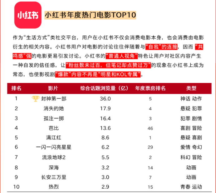 小红书年度热门电影Top10榜单