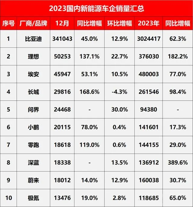 2023年国内新能源品牌销量TOP10