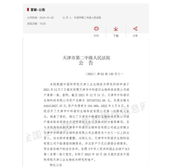 早在2023年10月20日,全国企业破产重组案件信息网即发布信息称,天津市第二中级人民法院(下称“天津二中院”)根据天津工业生物所的申请,于2021年12月7日受理中科诺识破产清算一案。经查明,中科诺识资产总额为3.97亿,负债总额为4.16亿元,资产负债率为104.86%。同时,天津二中院未收到中科诺识或出资额占中科诺识十分之一以上的出资人向其申请重组。