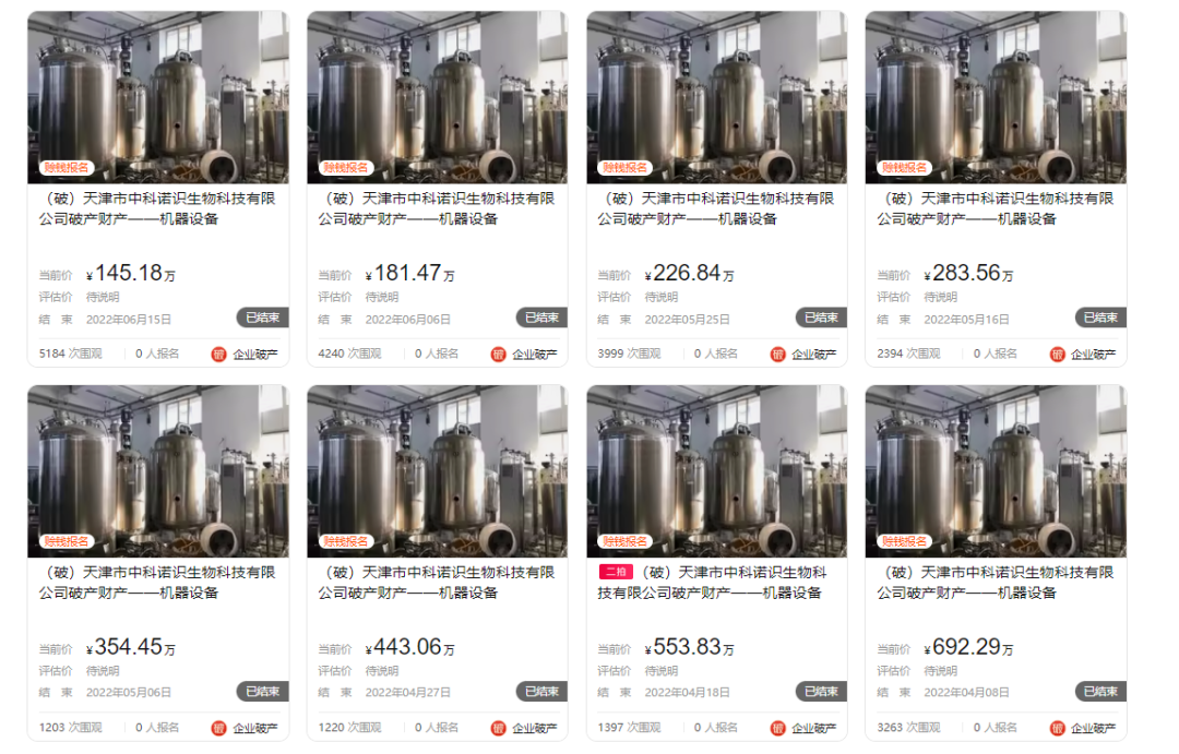 青眼注意到,自天津二中院接手中科诺识破产清算案以来,于2022年10月到2023年9月期间,中科诺识股权、无形资产、机器设备等6个标的在淘宝网阿里拍卖破产强清平台上拍卖,其中仅一个标的顺利成交,其余标的经过多轮降价后均流拍。