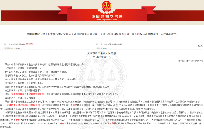 根据中国裁判文书网2021年7月16日发布的《天津工业生物所与天津世纪药业、诺信科技专利权转让合同纠纷一审民事判决书》显示,早在2015年1月21日,天津工业生物所与天津世纪药业签订了“发酵法制备麦角硫因技术”项目的《技术许可合同》,约定天津工业生物所将7项专利使用权授予天津世纪药业及双方合作的项目公司(合同中称“新公司”,也即中科诺识)使用,合同价款包括超1900万元的现金,以及产业化提成和中科诺识10%的股份。