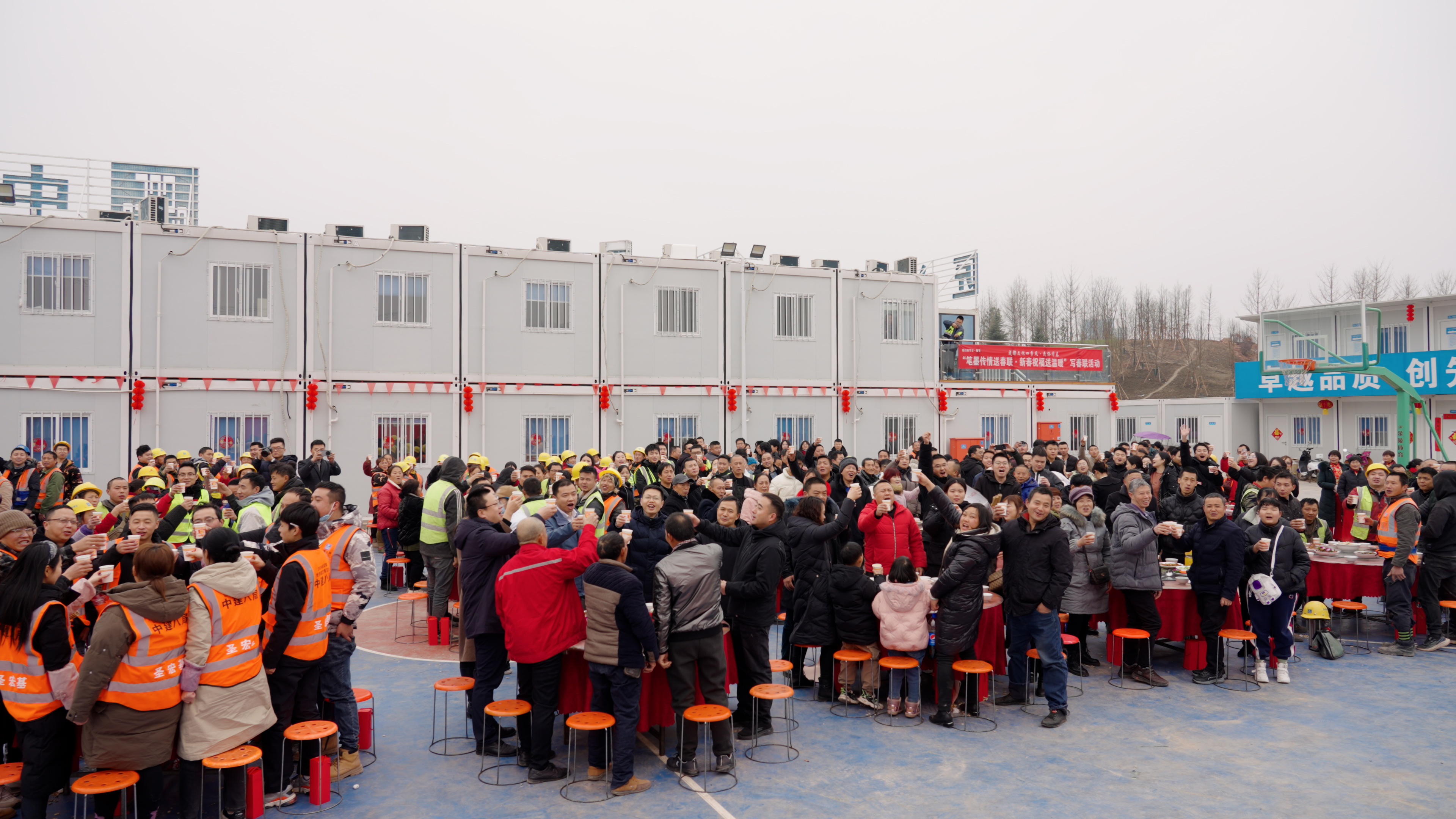 上午11点过,随着舞台上音乐响起,热闹的团年饭在歌声和舞蹈中正式拉开帷幕。来自五湖四海的工友们围桌而坐,同斟共饮。大肘子、蒸甲鱼、咸烧白……四川坝坝宴的“九斗碗”豪华配置,弥漫着阵阵香气,给工友们带来新春佳节的丝丝暖意。