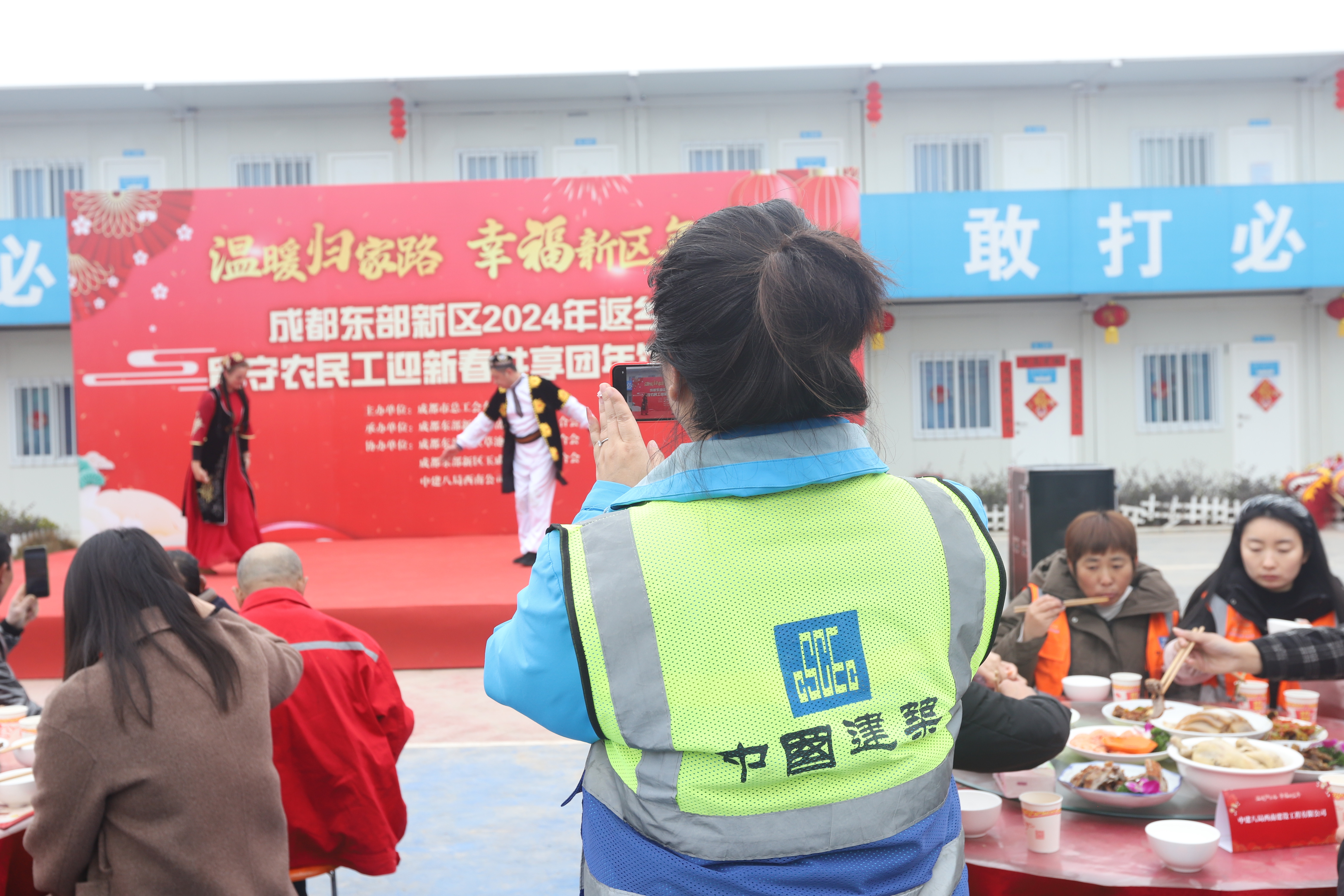 2月6日,在2024成都世园会主会场内,平日热火朝天的建设现场搭起了大舞台、摆上了大圆桌,来自主会场、交投航空投资总部民航科技创新示范区等项目的建设者以及新区返乡务工人员齐聚一堂共同团年,喜迎新春。在外打拼一年有汗水、艰辛,也有思念和收获万般滋味化作一桌桌热气腾腾的菜肴和工友之间暖心的问候。