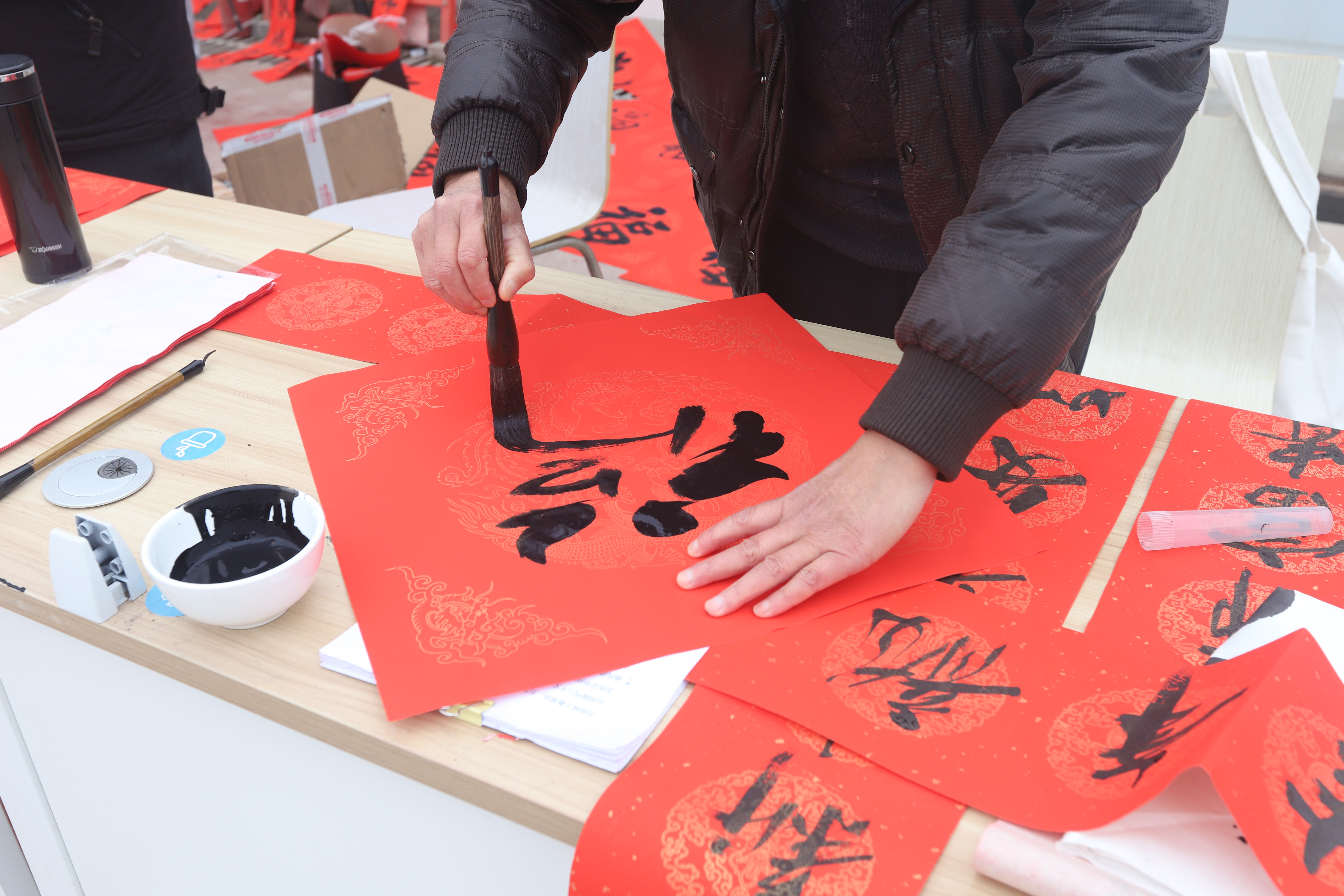 5位新区的书法爱好者在现场铺上红纸,蘸墨挥毫,为务工人员写春联、写福字,送上新春祝福。