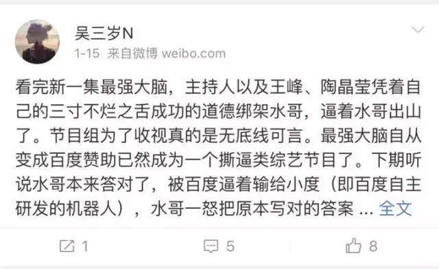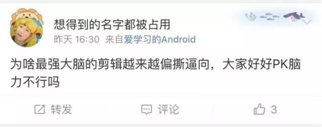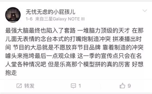 从《最强大脑4》引发民愤不难看出,对于素人扎堆的节目中撕X戏码的上演,观众不但没觉得有观赏性,反而全是反感和不满。笔者认为,这样的过时的“套路”早已让网友产生审美疲劳,还是少用为妙。对于制作团队本身而言,这样的引流误区,难道不应该趁早走出来吗?