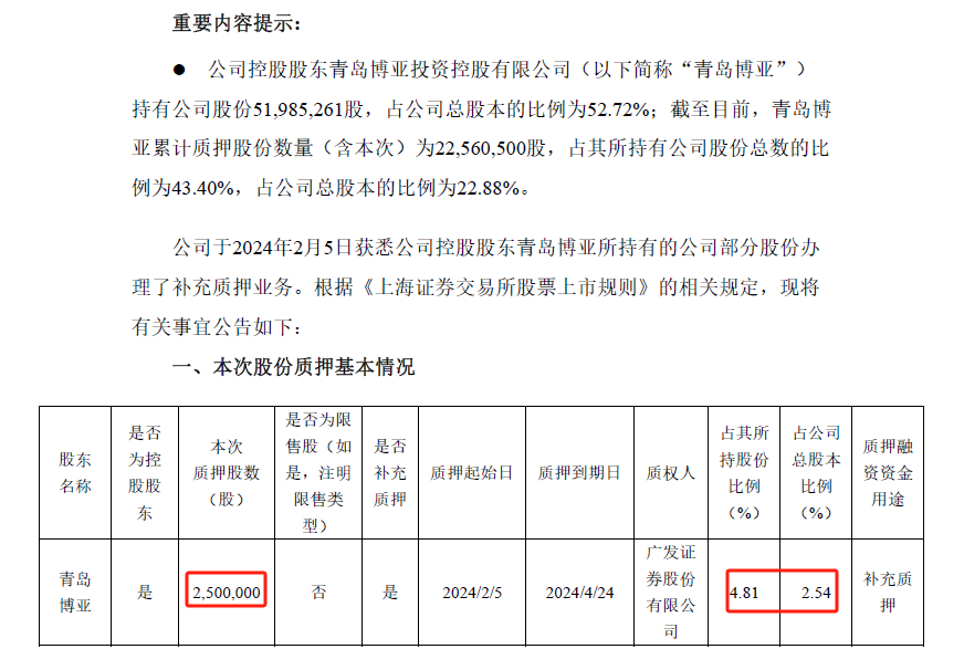 截至2月5日公告披露时,青岛博亚累计质押股份数量(含本次)为22,560,500股,占其所持有公司股份总数的比例为43.40%,占公司总股本的比例为22.88%。”