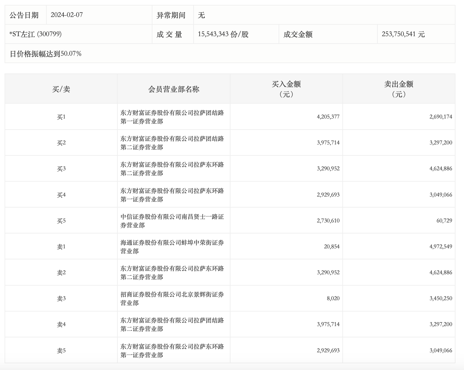 龙虎榜丨*ST左江今日上演“地天板”, “拉萨天团”占七席