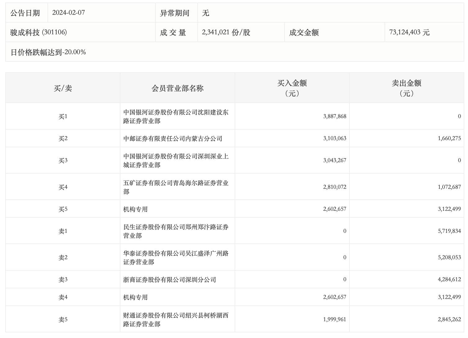 2月7日,骏成科技今日跌停,全天换手率达11.23%,振幅达20%。龙虎榜数据显示,营业部席位合计净卖出646.63万元。其中,机构买入260.27万元,卖出312.25万元,合计净卖出51.98万元。此外,民生证券郑州郑汴路证券营业部、华泰证券吴江盛泽广州路证券营业部分别卖出571.98万元、520.81万元;中国银河证券沈阳建设东路证券营业部、中邮证券内蒙古分公司分别买入388.79万元、310.31万元。
