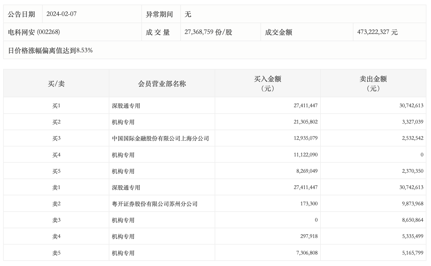 2月7日,电科网安今日涨停,全天换手率达3.25%,振幅达9.14%。龙虎榜数据显示,营业部席位合计净买入2082.28万元。其中,机构买入4830.17万元,卖出2484.96万元,合计净买入2345.21万元。此外,深股通专用、中国国际金融上海分公司分别买入2741.14万元、1293.51万元;深股通专用、粤开证券苏州分公司分别卖出3074.26万元、987.40万元。