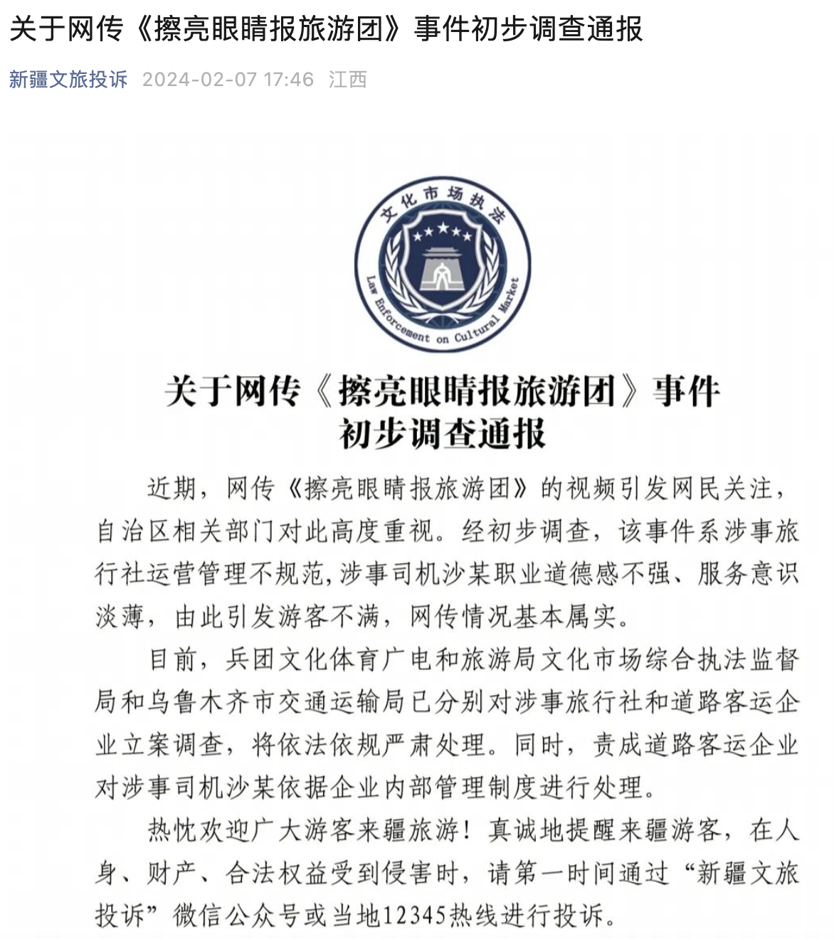 2月7日,“新疆文旅投诉”官微通报,近期,网传《擦亮眼睛报旅游团》的视频引发网民关注,自治区相关部门对此高度重视。经初步调查,该事件系涉事旅行社运营管理不规范,涉事司机沙某职业道德感不强、服务意识淡薄,由此引发游客不满,网传情况基本属实。