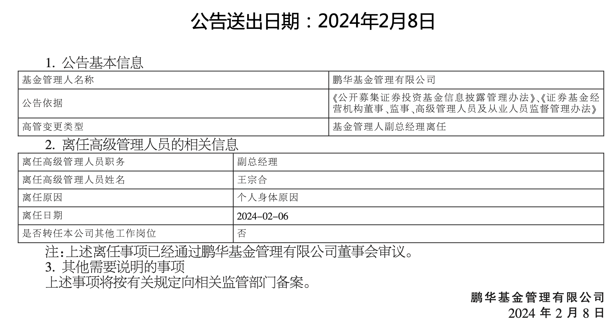 2月8日,鹏华基金发布公告称,公司副总经理王宗合因个人身体原因已于2月6日离任,且无转任公司其他工作岗位的说明。
