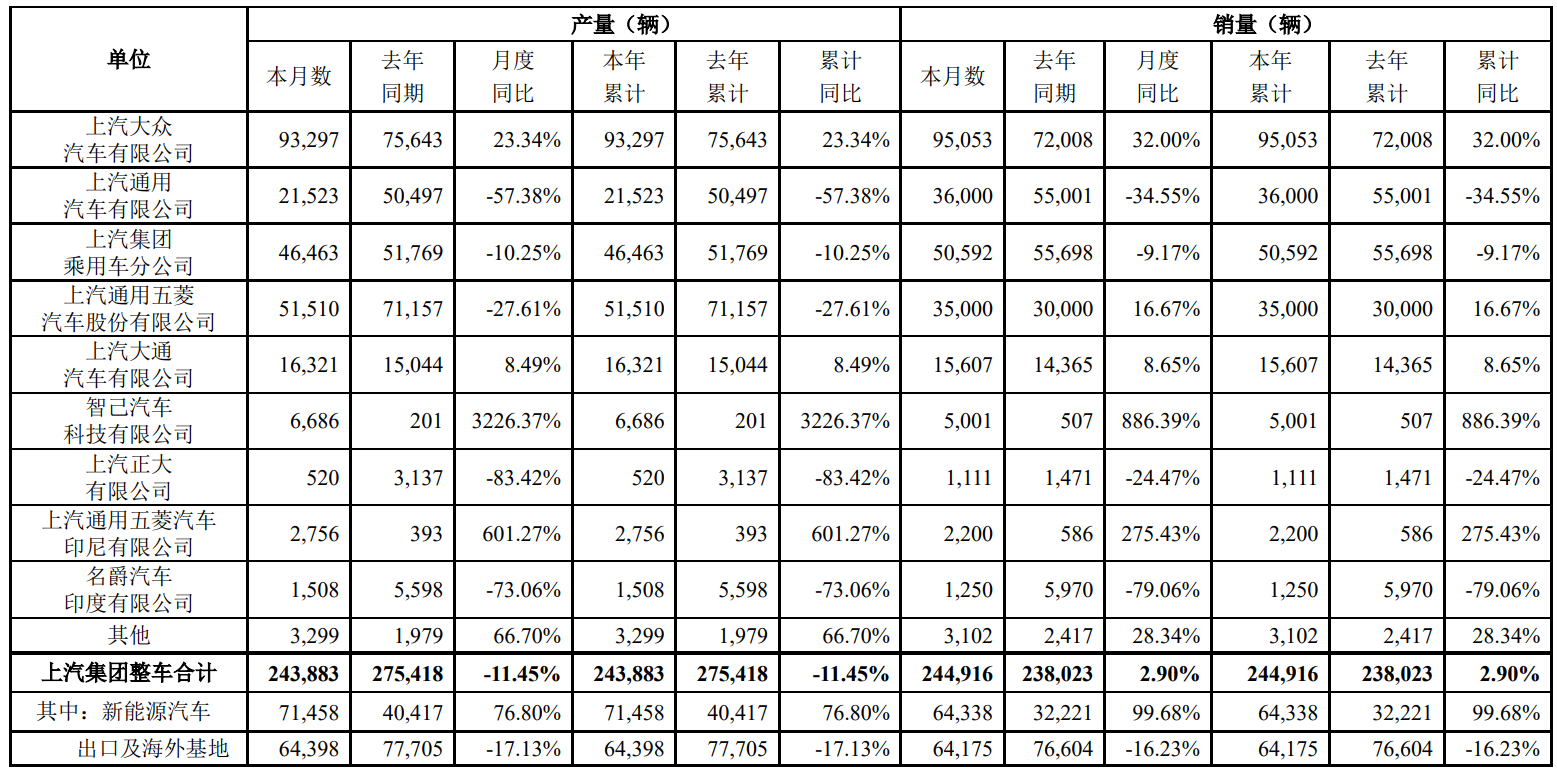 上汽集团2月8日公告,1月整车合计销售24.49万辆,同比增长2.90%;其中新能源汽车销售6.43万辆,同比增长99.68%。