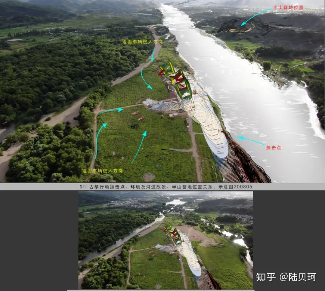 然后在一些局部的画面里面,我们又找了一个看起来有水,就是“古筝行动”中那个竖起来的两根杆子的地方地方。我们拍的时候其实只拍了单边的一根杆子,那个地方是天然的有水的地方,但是并不是一个真正的河道,是一个弧形的地形,但最后成片看起来会觉得它好像是在同一个地方拍摄的。。但这个地方跟我们撞船的位置、营地的位置等画面,其实是设计好之后分别找了六七个不同的地点单独拍摄,之后再拼接起来的
