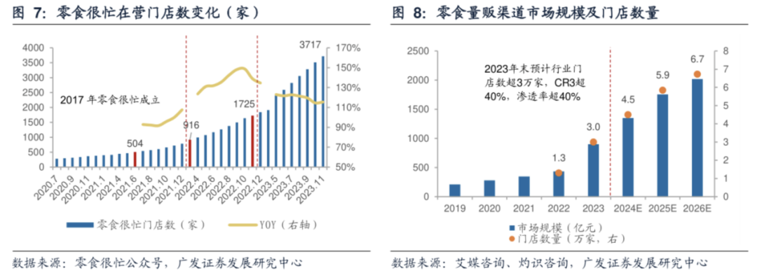 另一方面,零食销售渠道也由分散化的店铺向更为集中的零食集合店等创新模式发展。在新零售、新商业、新消费等概念的加持下,很多新兴玩家相继涌入零食赛道,如零食很忙、赵一鸣零食等地域龙头用不同于传统零食巨头的玩家的打法,在巨额资本加持下不断渗透这个万亿市场。