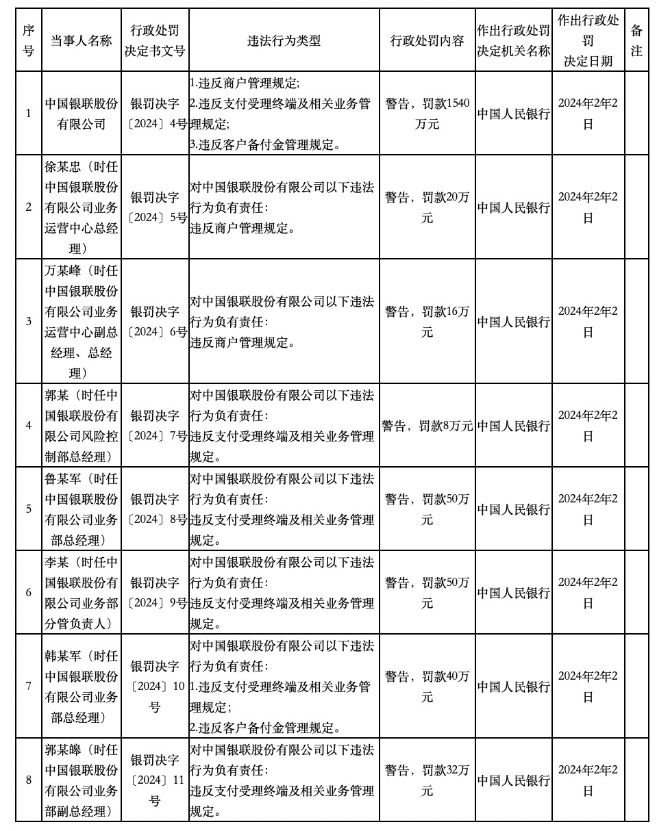 具体来看,中国银联股份有限公司因违反商户管理规定、支付受理终端及相关业务管理规定和客户备付金管理规定被警告,罚款1540万元。
