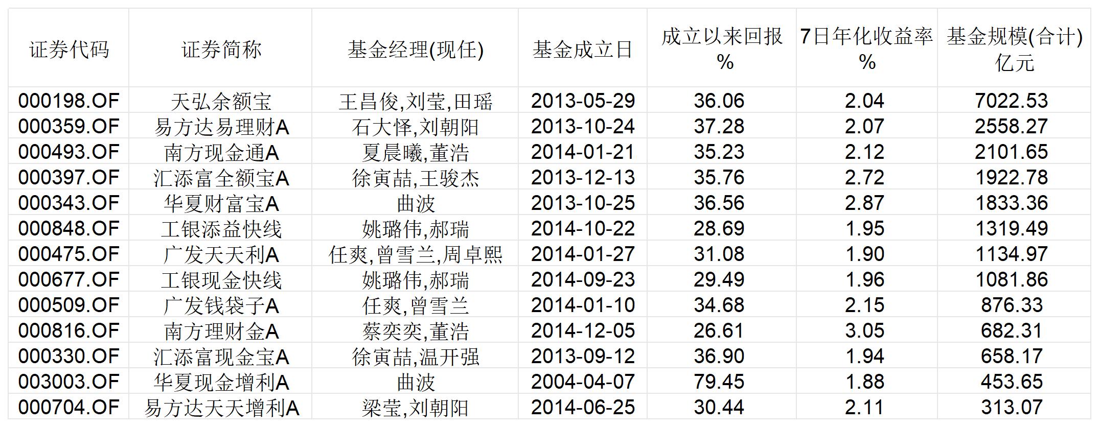 从名录来看,13只重要货币基金分布在天弘、易方达、南方、汇添富、工银瑞信、华夏、广发等7家公募。
