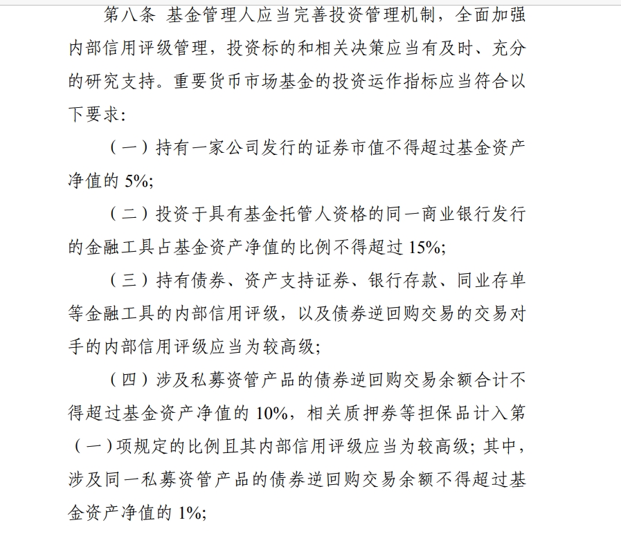在重要货币市场基金的投资运作指标方面,也需要满足多项要求。例如,持有一家公司发行的证券市值不得超过基金资产净值的5%;投资于具有基金托管人资格的同一商业银行发行的金融工具占基金资产净值的比例不得超过15%;主动投资于流动性受限资产的规模合计不得超过基金资产净值的 5%;投资组合的平均剩余期限不得超过90天;投资组合的杠杆比例不得超过110%。