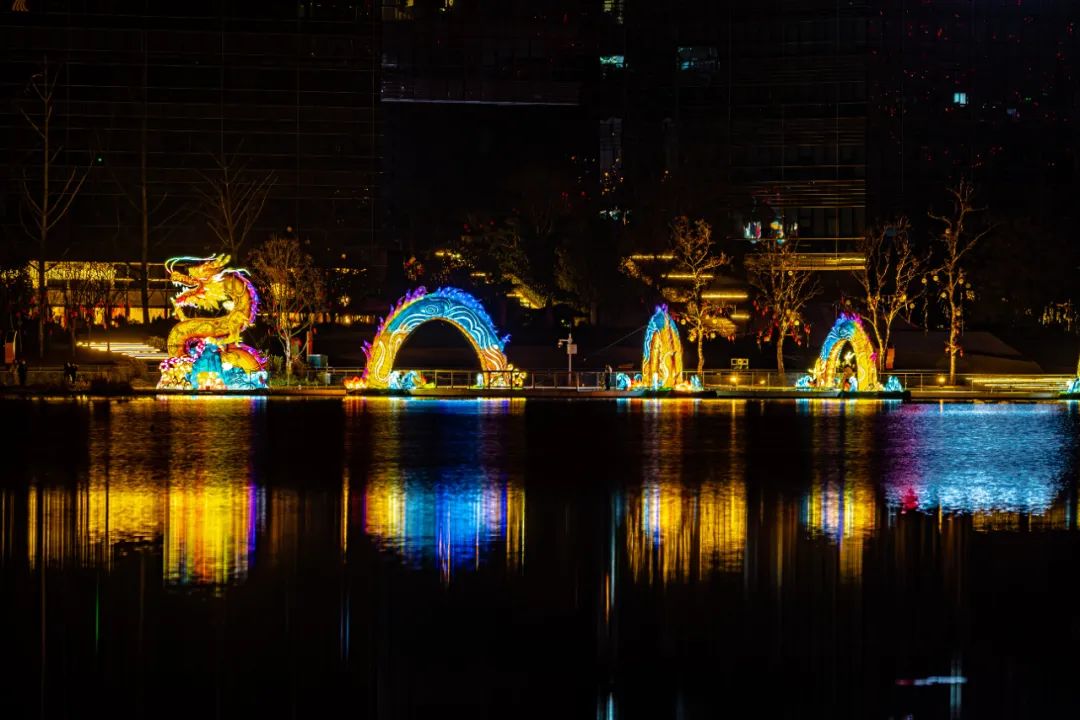 夜晚时分,龙身被灯光照亮,五彩斑斓的灯光倒映在波光粼粼的湖面,满眼都是绚烂的流光溢彩。