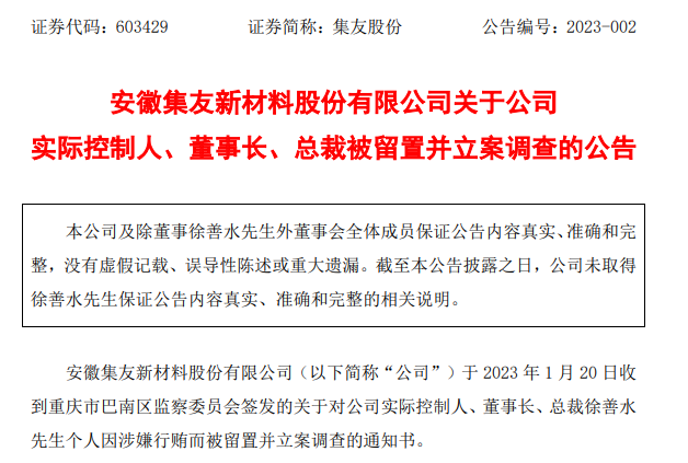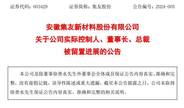 据每经网消息,2月8日晚,集友股份(SH603429)突然公告称,实控人、董事长、总裁徐善水再次被留置。