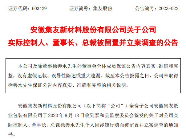 四个月后,2023年8月18日,集友股份收到泰和县监察委员会通知,徐善水再度因涉嫌行贿而被留置并立案调查。8月20日,公司再度召开董事会,由曹萼继续代为履职。