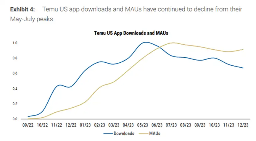 对Temu来说,在尝鲜之后消费者开始对其平台的兴趣逐渐下滑大概是它们无法放弃大手笔营销的关键,根据大摩最新调研显示,21%的受访者表示他们在过去3个月内曾在 Temu 上购物。相比之下,11月份这一数字为25%,9 月份的调查为27%。自2023年年中以来,整体趋势是Temu购物者渗透率呈现下降趋势。