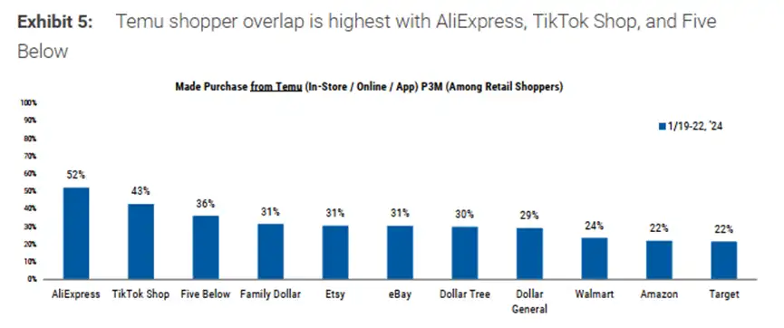 根据大摩的数据,Temu用户与其他平台的重叠程度最高的是阿里速运通、TikTok Shop 和 Five Below。根据AlphaWise数据,52%的速运通购物者也使用Temu,而TikTok Shop和Five Below的用户比例分别为43%和 36%。重叠程度最低的反而是大型零售商,像是沃尔玛、亚马逊和塔吉特。