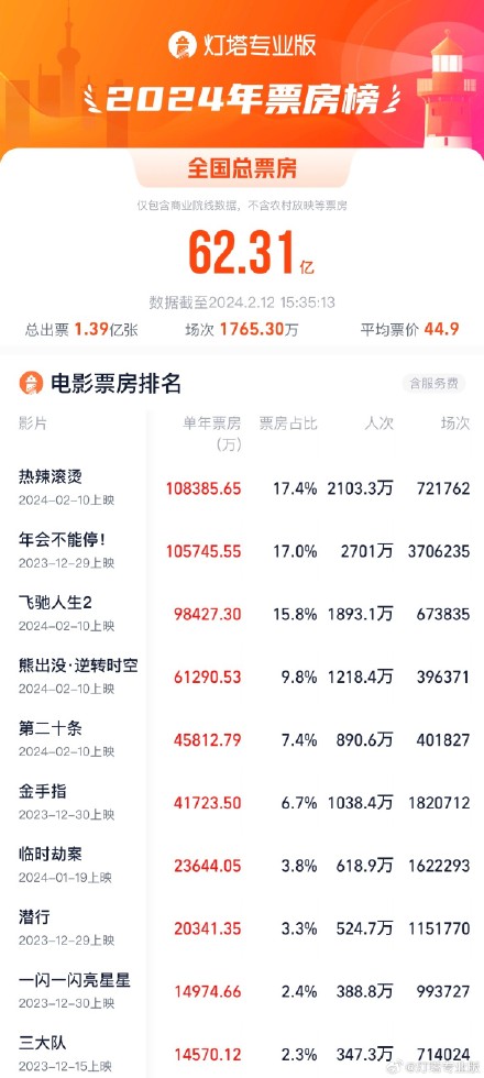 据灯塔专业版实时数据,截至2月12日15时35分,影片《热辣滚烫》含预售票房突破10.8亿,登顶2024年票房榜。