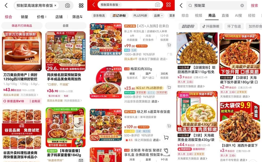 图:天猫、京东、抖音电商上售卖的年夜饭截图