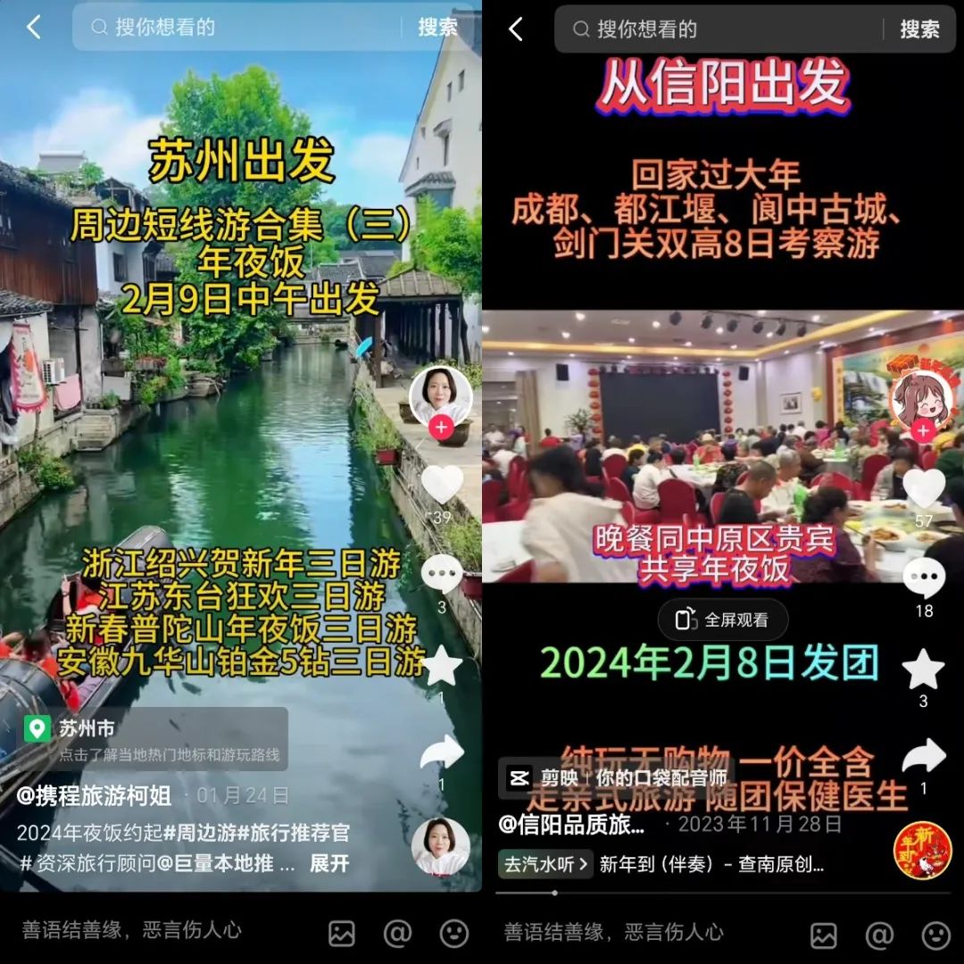 在抖音上,今年还出现了各种“年夜饭+”形式的消费,例如年夜饭定制、年夜饭旅游团等等,将年夜饭与旅游相结合。