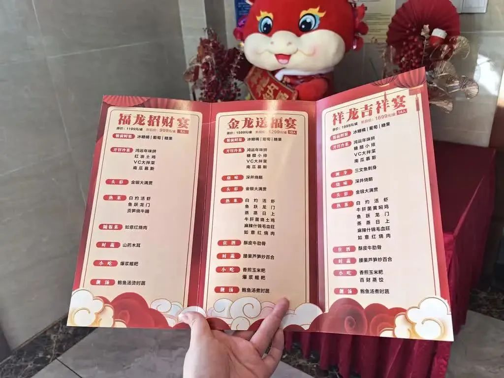 在天香人和百味海鲜城,年夜饭套餐的菜单看上去喜气吉祥,“福龙招财宴”“金龙送福宴”“祥龙吉祥宴”,不同的套餐,都有着不一样包含龙字带有吉祥寓意的名称。其店长王向梅表示:“这是我们专门为龙年设计的名称,除此之外,针对除夕当天预订大厅的顾客,我们有送波士顿龙虾的活动,除夕当晚,我们也会安排一些增添年味的小游戏。”