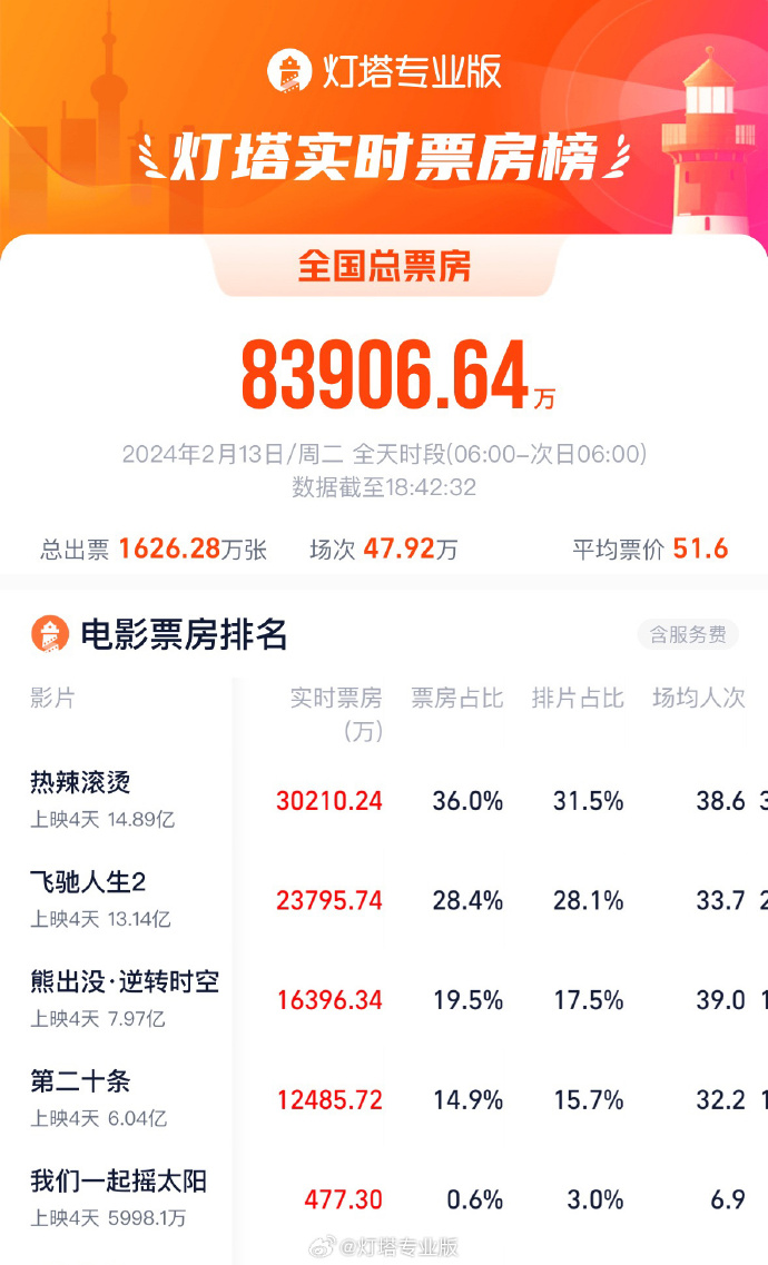 据灯塔专业版数据,截至2月13日18时42分,影片《热辣滚烫》映后连续4天单日票房突破3亿。该片当前票房已突破14亿。