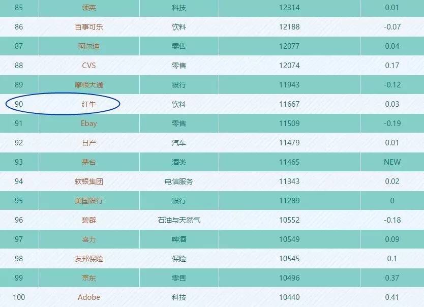 在去年公布的《2016年BrandZ全球最具价值品牌百强榜》上,红牛位列第90位,高于茅台、京东等中国知名品牌。