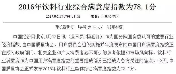 近日,中国经济网消息称:中国质量协会正式发布2016年饮料行业整体综合满意度指数为78.1分。而在六大饮料分类中,功能饮料的综合满意度指数最高,达到了82.7分。