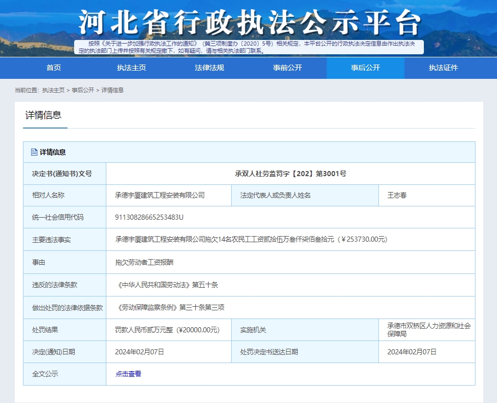 据河北省行政执法公示平台显示,承德宇厦建筑工程安装有限公司拖欠14名农民工工资贰拾伍万叁仟柒佰叁拾元(¥253730.00元),违反《中华人民共和国劳动法》第五十条,承德市双桥区人力资源和社会保障局依据《劳动保障监察条例》第三十条第三项对其罚款人民币贰万元整(¥20000.00元)