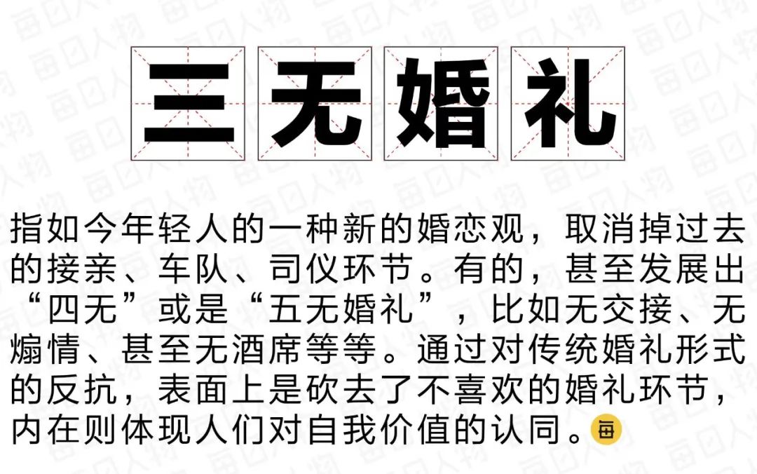 如今,像这样,选择举办三无婚礼的年轻人正在变多。前两天,广东女孩晓彤举办的婚礼上,在结婚时取消了七项结婚流程(交接、长辈发言、豪车车队接亲、复杂的结亲游戏、新郎“亲脚”、过度煽情、不合时宜的玩笑)登上了微博热搜,阅读量高达2.3亿,得到了无数网友的支持。大家被传统婚礼上的繁复的环节、昂贵的费用折磨得疲惫不堪,三无婚礼的出现了,开始解救苦苦挣扎的年轻人们。