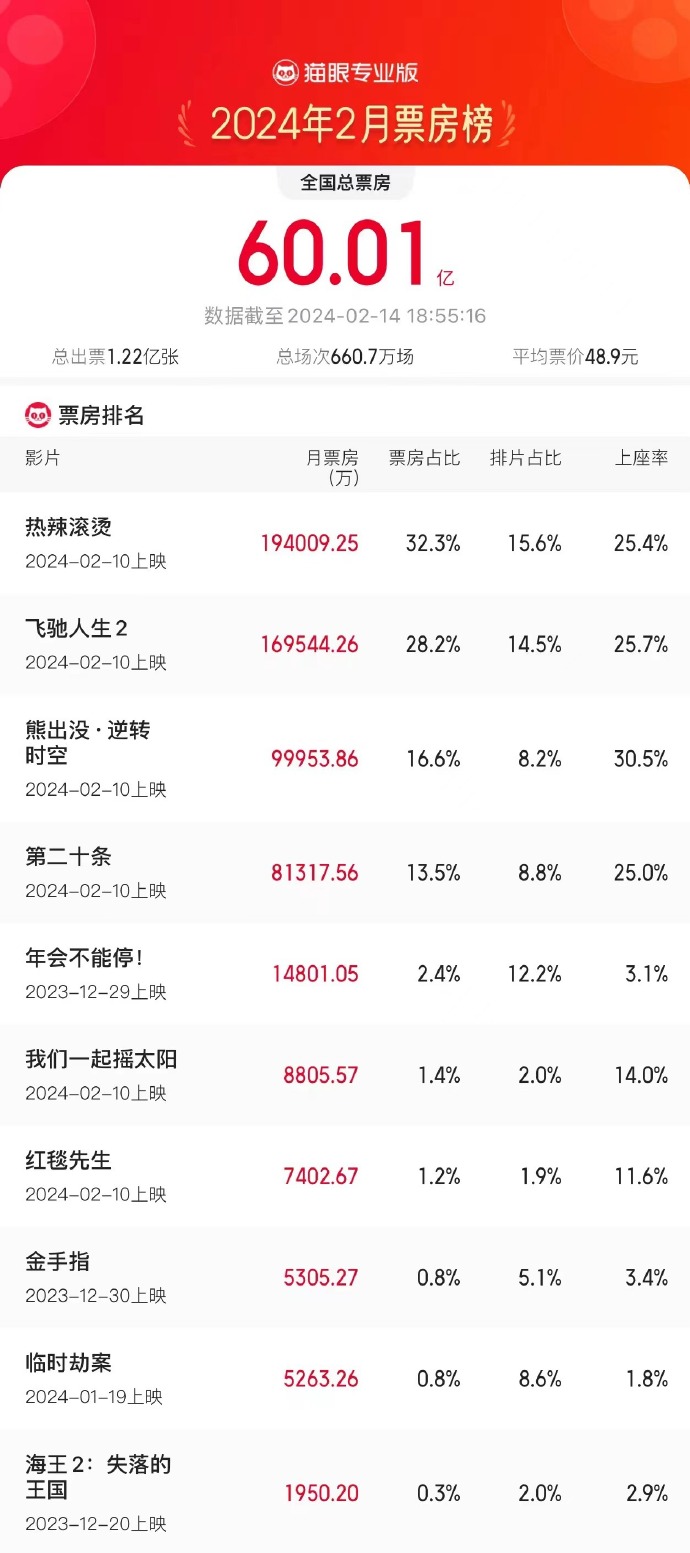 据猫眼专业版数据,2月14日18时55分,2024年2月总票房破60亿,《热辣滚烫》《飞驰人生2》《熊出没·逆转时空》分列2月票房榜前三位。
