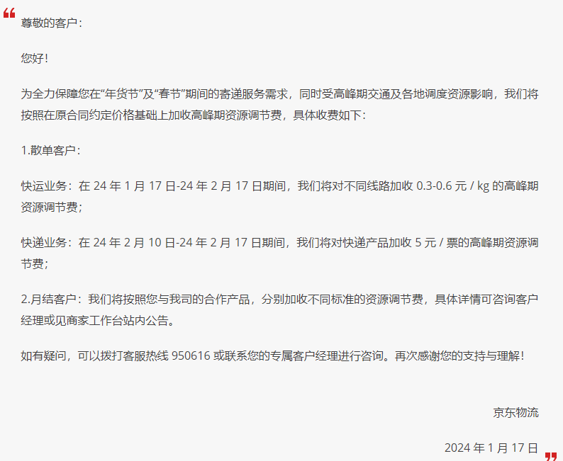 如京东物流表示,散单客户中的快递业务春节期间加收5元/票的资源调节费,月结客户加收不同标准的资源调节费。德邦快递对部分客户、部分产品收取0.3元/kg至0.5元/kg的春节资源调节费。顺丰表示对顺丰卡航、大于20kg(含)顺丰标快、大于20kg(含)顺丰干配等产品,收取0.1至1.2元/kg的资源调配费。