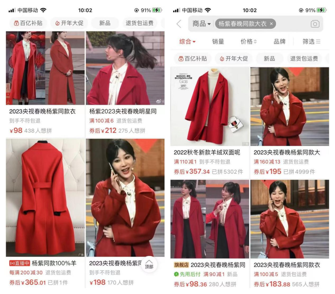 以2023年春晚为例,当晚8点开始,众多明星的同款服装悉数亮相登上热搜,秦岚同款绿色开衫、赵丽颖同款红裙、杨紫同款大衣和同款女鞋,分列淘宝热搜榜第1-4位。随后,各平台各直播间也紧跟热度,迅速上线了相关产品。