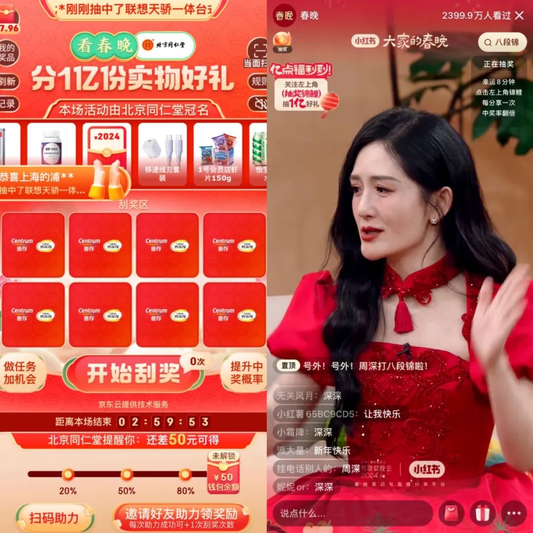 京东、小红书两大“氪金玩家”以赞助商的形式强势入局春晚争夺战。早在1月19日,小红书就官宣成为2024年总台春晚笔记与直播分享平台,打响大厂春晚营销的第一枪。随后,在湖南卫视跨年晚会博得不小声量的京东,凭借1亿份实物好礼和30亿元红包的“大手笔”投入,亮相春晚舞台。