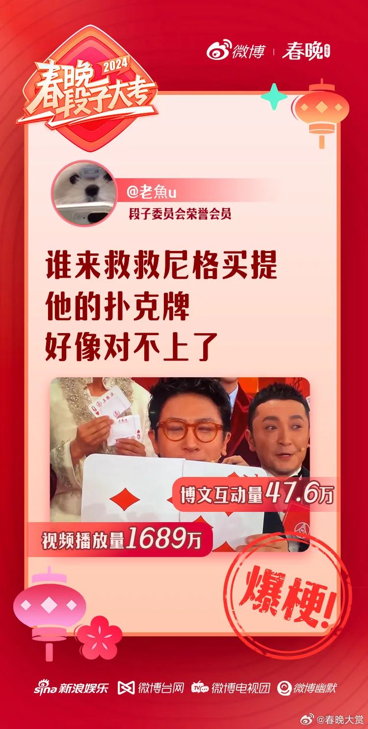 岳云鹏和孙越一登场,微博网友将两人的体型差比喻为过年前后的自己,附和了“每逢佳节胖三斤”的国际惯例;春晚为80、90后们奉上的一份特殊礼物——《看动画片的我们长大了》,让网友感慨“童年完成了闭环”。尼格买提在扑克牌魔术穿帮时的慌乱眼神更是被微博网友第一时间捕捉,成为当晚热度最高的爆梗。