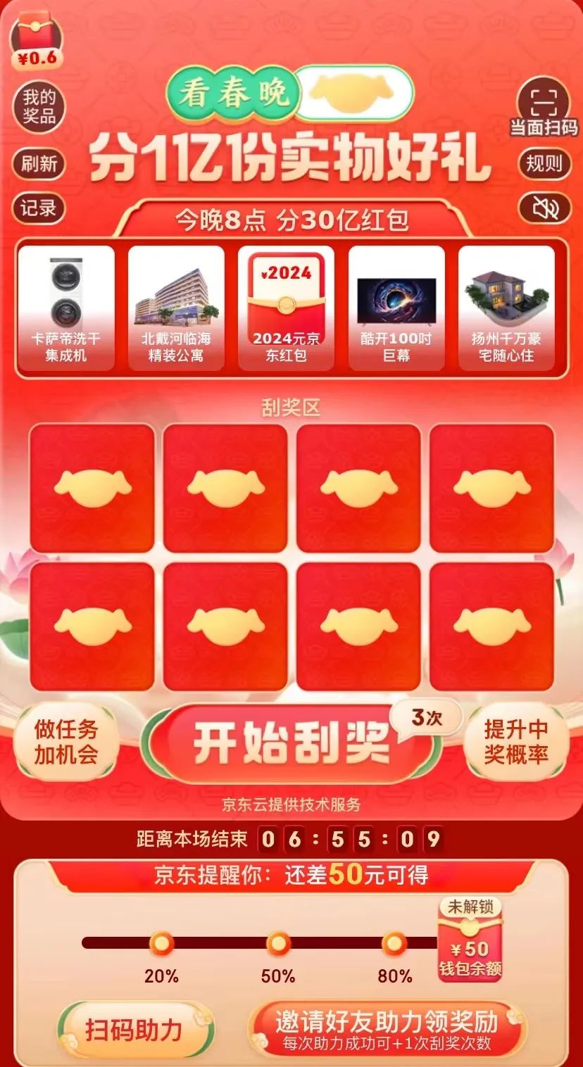 宏观目标体现在京东春晚的玩法层面。与京东在2022年的春晚“初舞台”相比,京东在玩法上“豪放”了几分。2022年,京东送出了总价值15亿元的红包和奖品,今年,京东略去了冗杂的“套路”环节,红包力度更是翻倍至30亿元,用户通过抽奖互动的形式,再支付一分钱,就可以赢得一亿份实物商品。