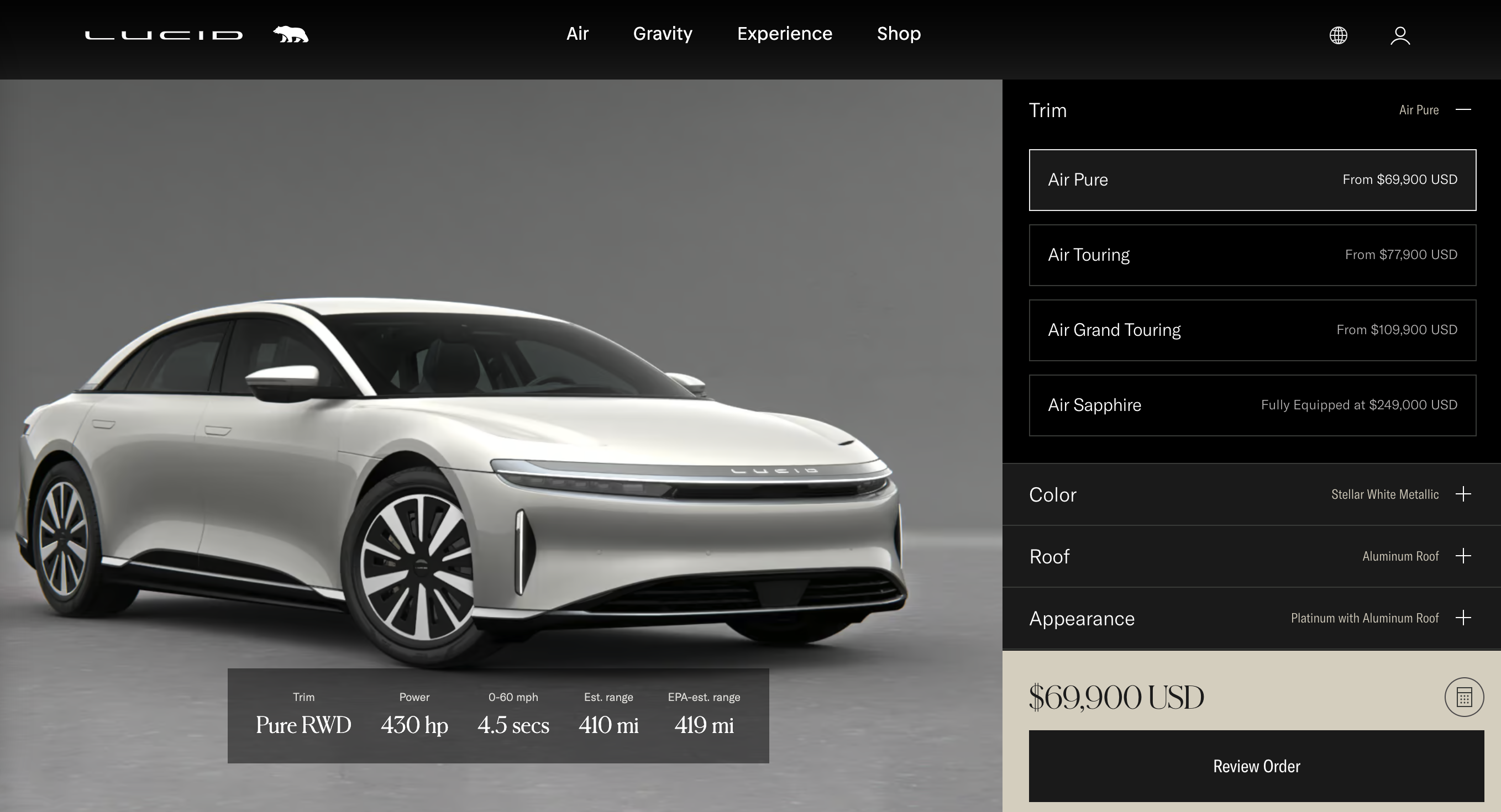 当地时间2月15日,美国电动汽车制造商Lucid宣布车型价格调整,Lucid Air Pure后轮驱动版售价为69,900美元起,Air Touring售价为77,900平方美元起,Air Grand Touring售价为109,900美元起。