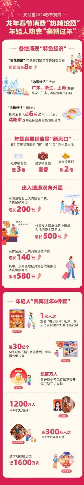 2月16日,支付宝公布春节数据报告显示,龙年春节各地涌现“特色经济”、年货直播出现流量“新风口”、出入境游双向升温。