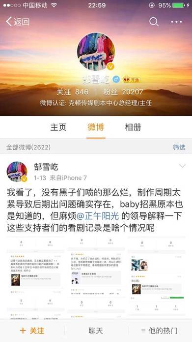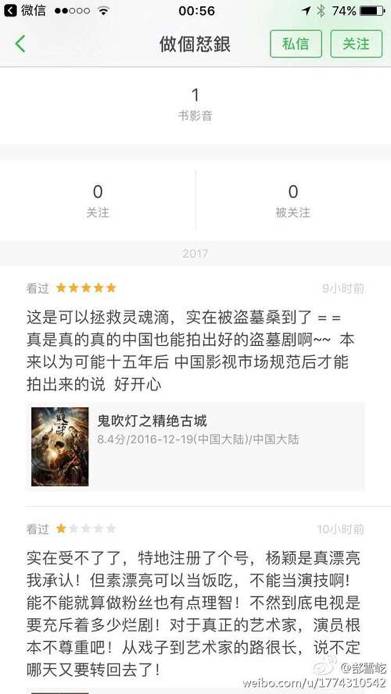 他给出的理由是,有几个给《孤芳不自赏》打1星的观众,给《鬼吹灯之精绝古城》打了5星。