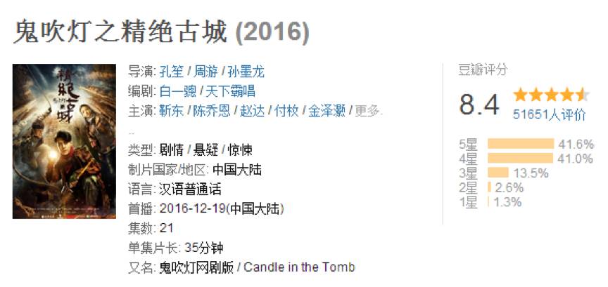 与之相反,《鬼吹灯之精绝古城》却在影像制作和剧情上保持了一贯的侯鸿亮水准,5万人参与打分,最终豆瓣评分8.4。