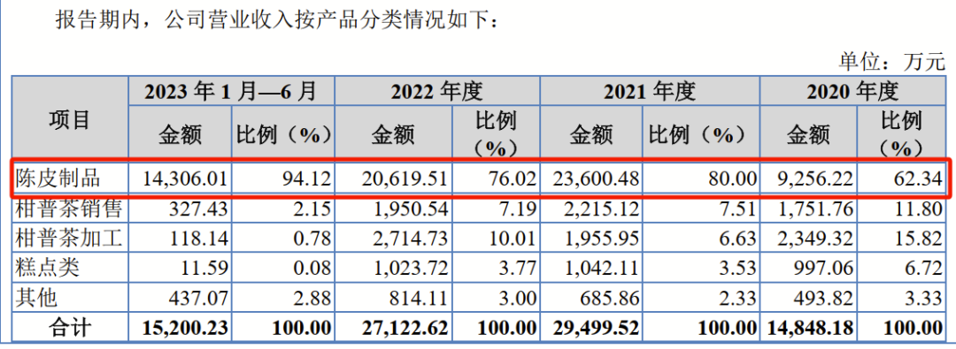 陈皮制品收入也是丽宫股份的营收大头,占营收的比例超过六成。同期,该业务营收分别为9256.22万元、2.36亿元、2.06亿元和1.43亿元,分别占主营业务收入的62.34%、80%、76.02%和94.12%。相比之下,柑普茶销售的收入占比则从2020年的11.8%,下降至2023年上半年的2.15%。同期,糕点类收入也从2020年的6.72%降至0.08%。
