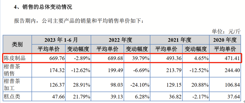 《招股书》显示,2021年、2020年,丽宫股份陈皮制品的均价不到500元/斤,但到了2022年、2023年上半年,这一数据分别涨至689.68元/斤和669.76元/斤。