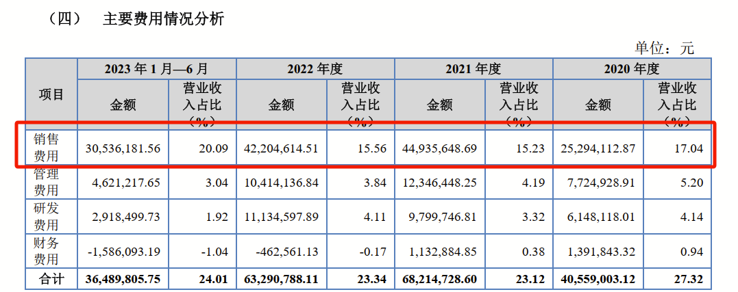 其中,来自经销渠道的收入为主要营收来源。该渠道的营收占当期营业收入的比例从2020年的62.48%,增长至2023年上半年的92.65%,呈现逐年上升的趋势。