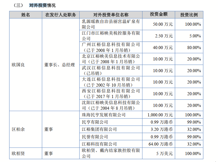 此外,区柏余对外投资单位超过5家,持股比例从32%到100%不等,同样涉及旅游、科技等行业,其中包括民亨有限公司、民誉有限公司、主营投资的江裕集团有限公司、江裕科技有限公司等。