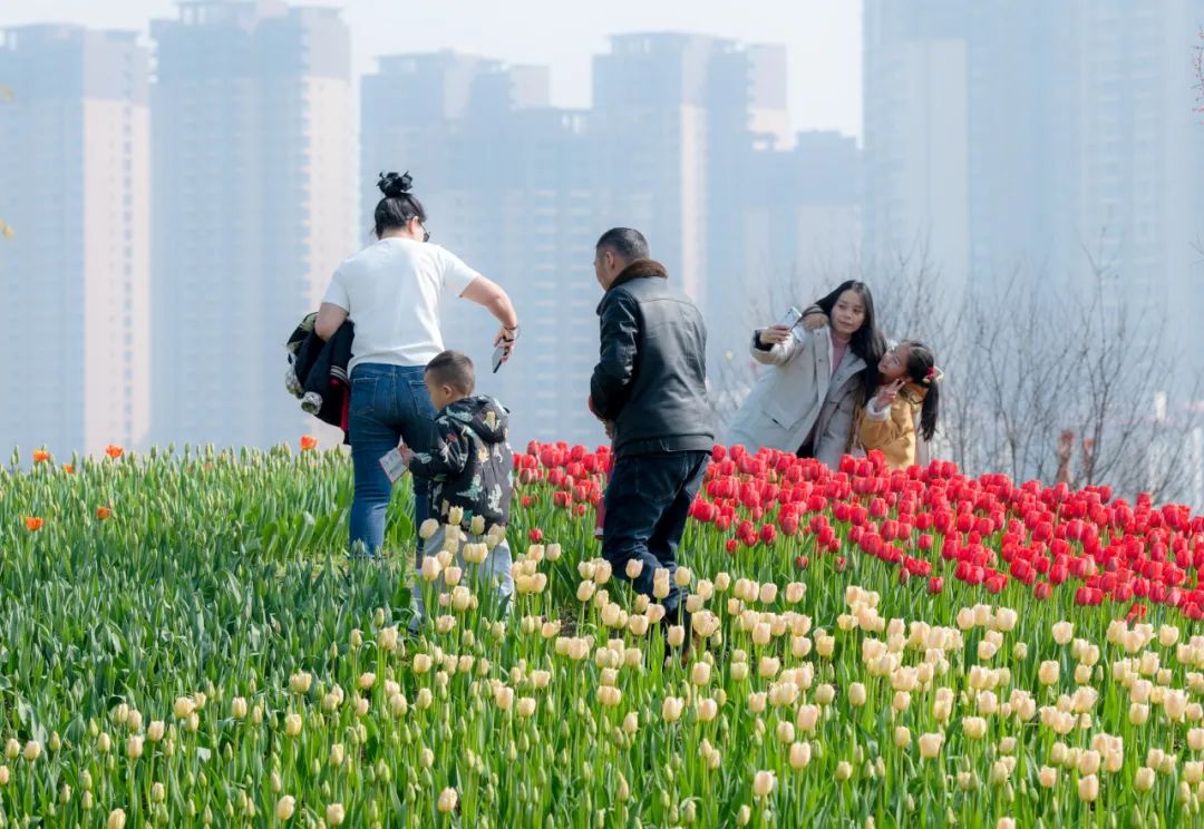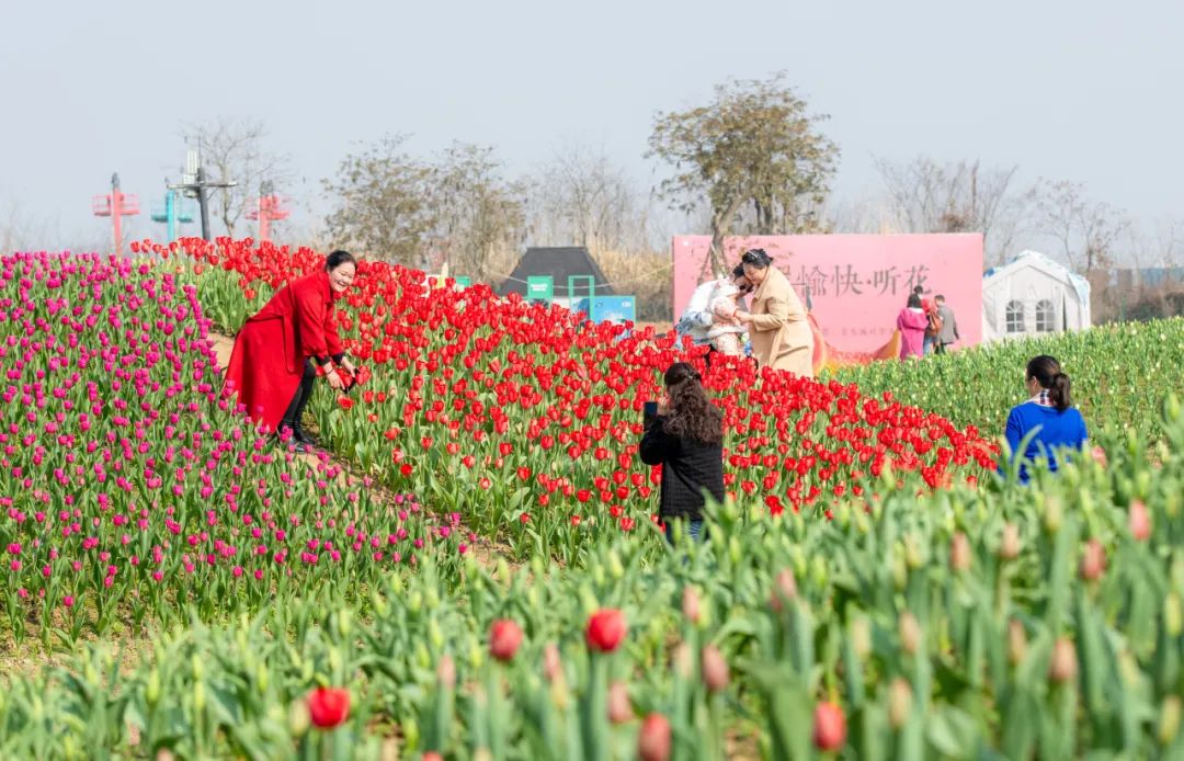 春暖花开,在蔚然花海景区,超美郁金香如约而至。2月15日,在蔚然花海,市民李女士不停地给自家的小孩拍照,留下春日的浪漫。据了解,在春节期间,3米超级大锅、花式烹调方式+超多种自助食物齐聚花海,将传统土灶烟火年味拉满。